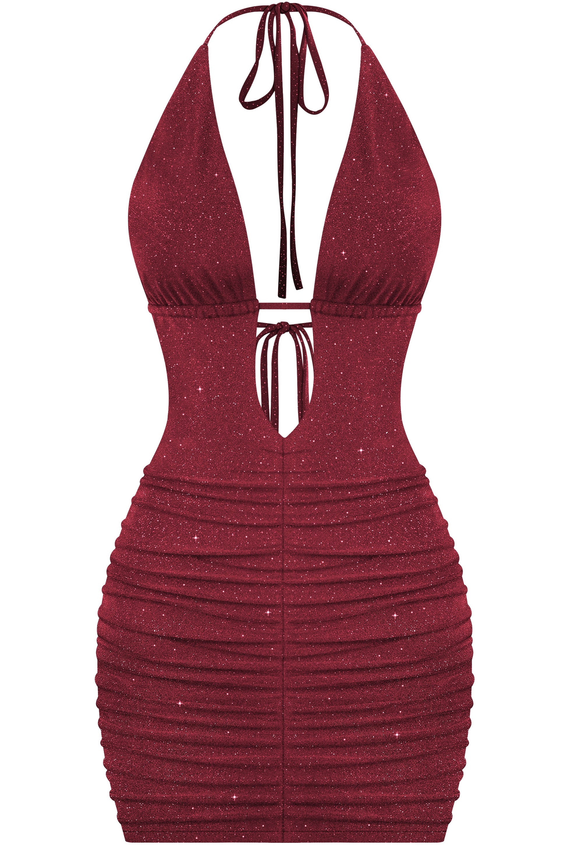 Halter Deep Plunge Glitter Mini Dress *burgundy and black