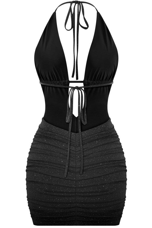 SLEEVELESS -HALTER BACK TIE -TRIANGLE BUST -DEEP PLUNGING NECKLINE -OPEN BACK -BACK SELF TIE -RUCHED SKIRT -MINI LENGTH -STRETCHY -DOUBLE LAYERED -SPARKLY, GLITTER FABRIC